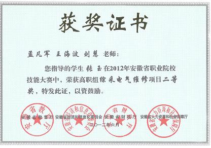 指导学生在省级机械创新大赛、技能大赛及其它各类赛项中多次获奖。2012年全国职业院校学生技能作品展洽会获优秀学生技能作品一等奖。王波、李长城两位同学在2012全国职业技能大赛中分别荣获个人二等奖。